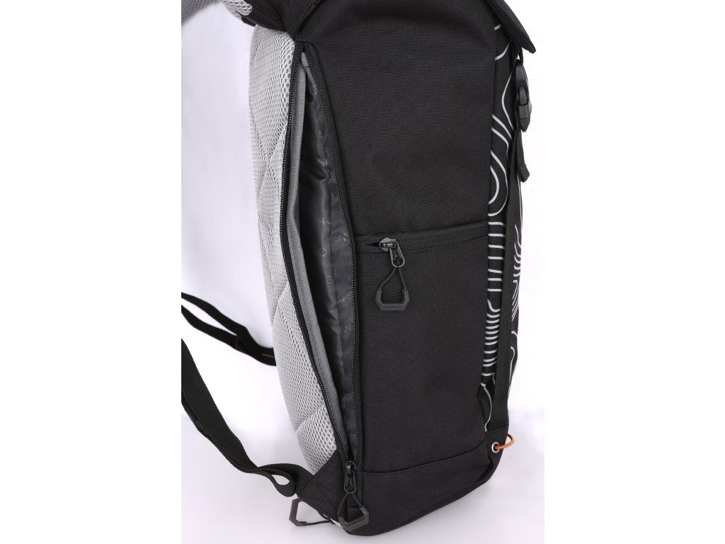 Výbava batohu Jibby: hlavní vstup se stahováním, boční kapsa na zip, boční elastická kapsa, boční úchyty na trekové hole, vnitřní organizér, kapsa na notebook (24 x 34 x 3 cm), reflexní potisk, pláštěnka, hrudní popruh.