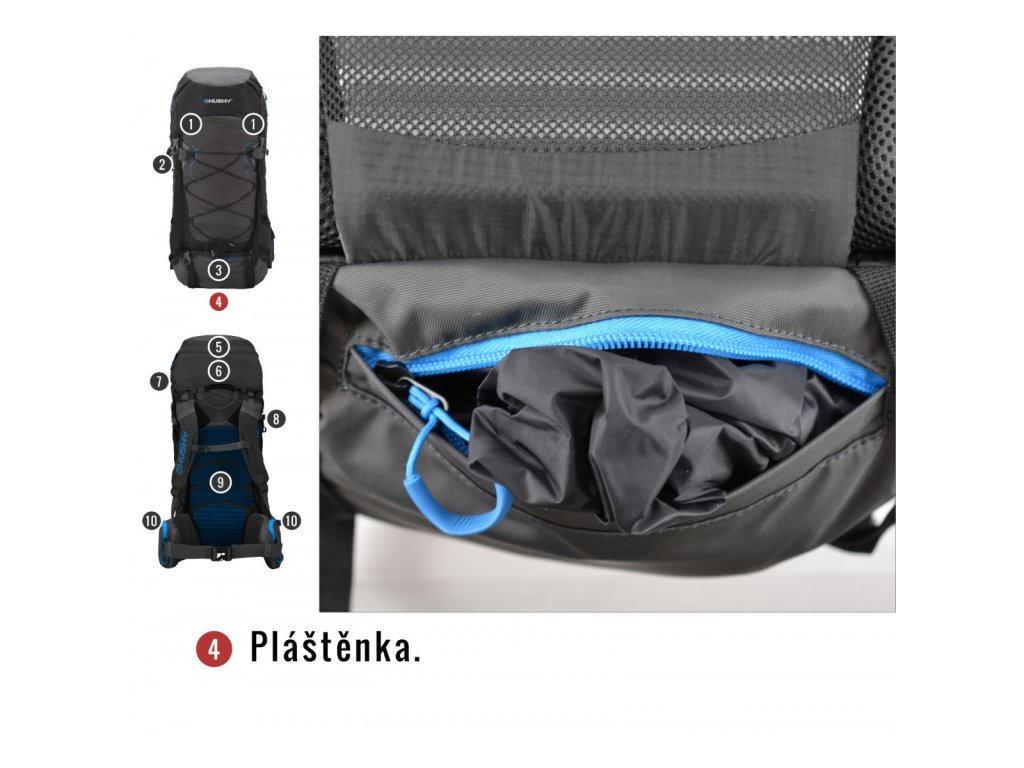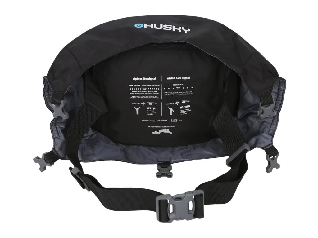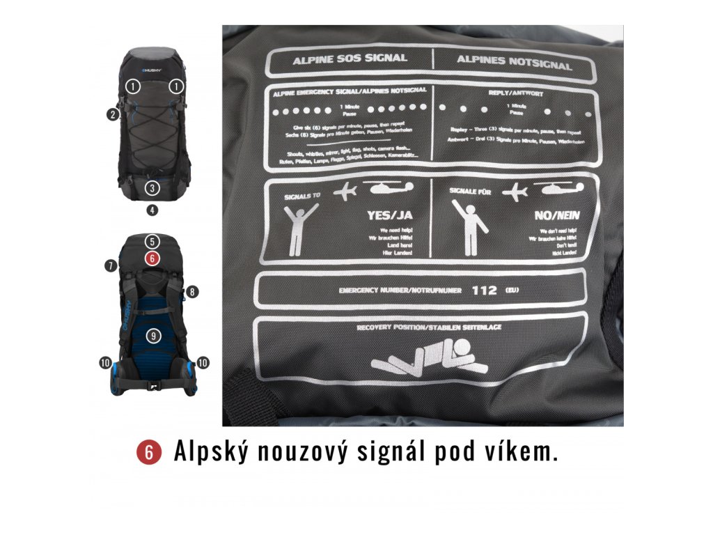 Odnímatelné víko, hrudní popruh, bederní pás, pláštěnka, emergency symbols.
