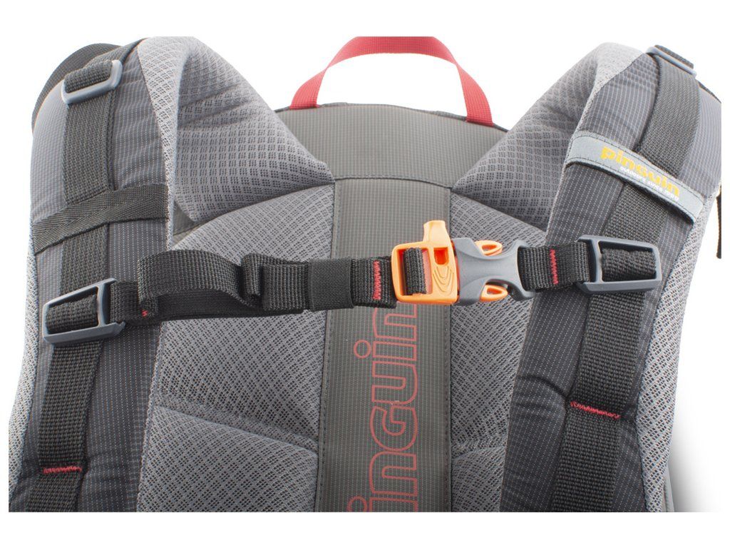 Výškově nastavitelný a odepínatelný hrudní popruh s píšťalkou pro případ nouze.