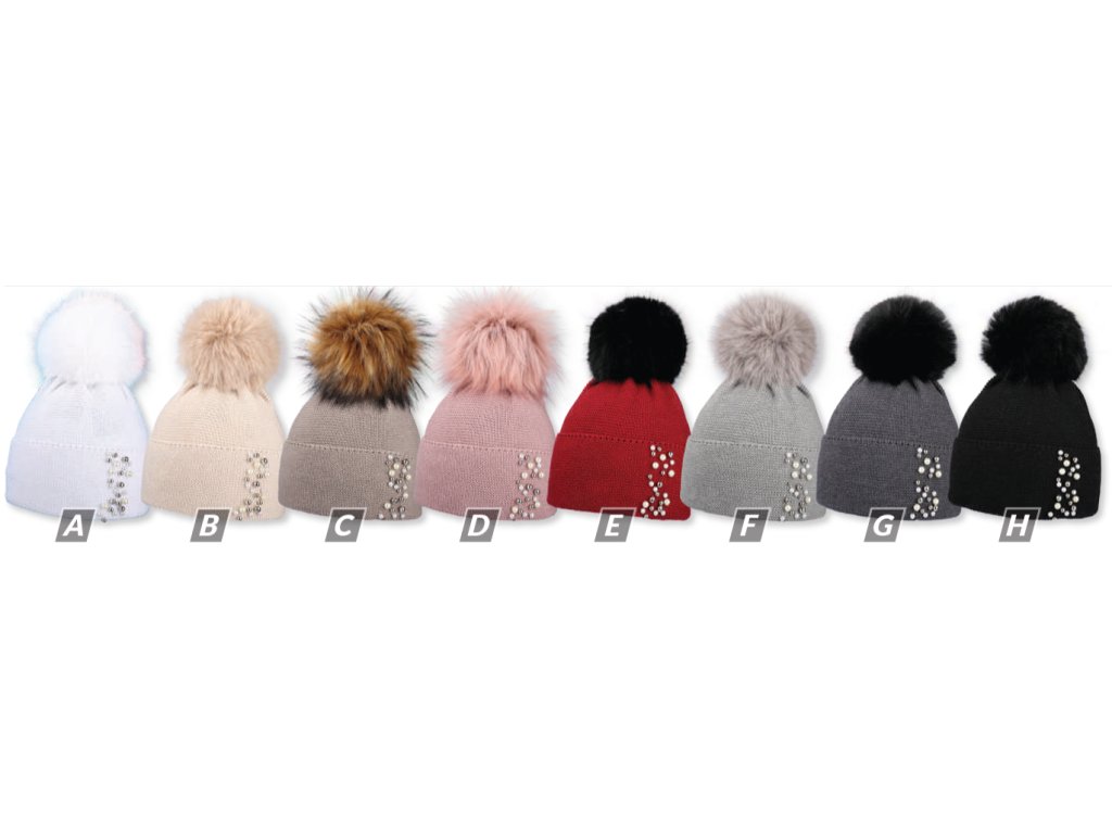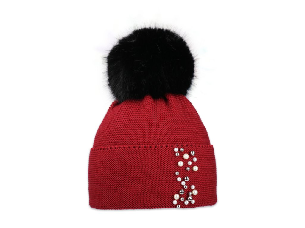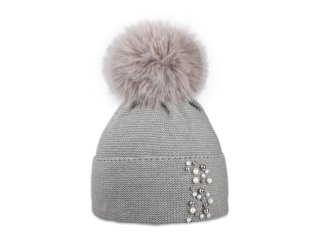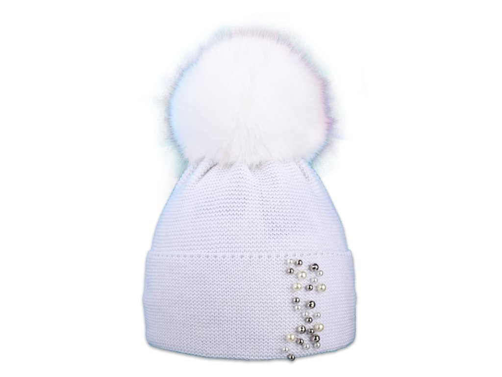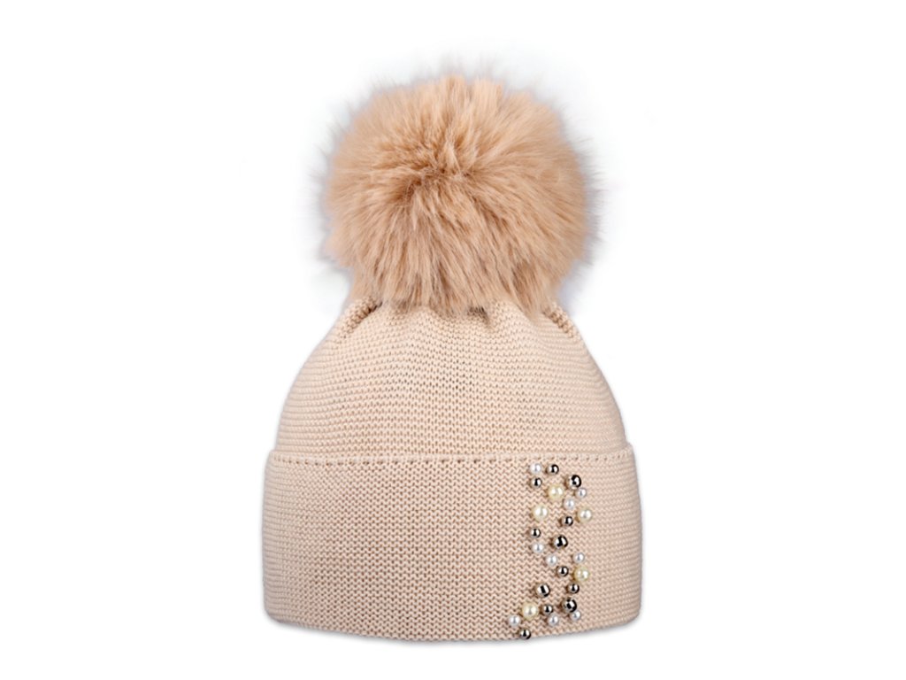 Dámská pletená zimní čepice s perličkami a kožešinovou bambulí.