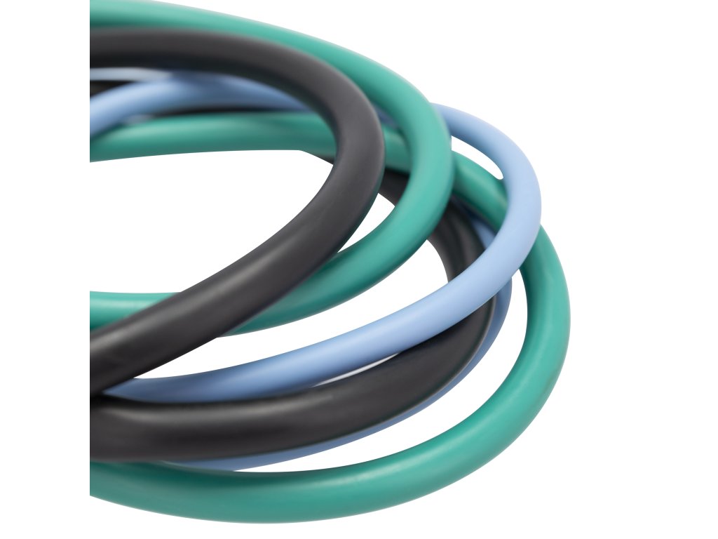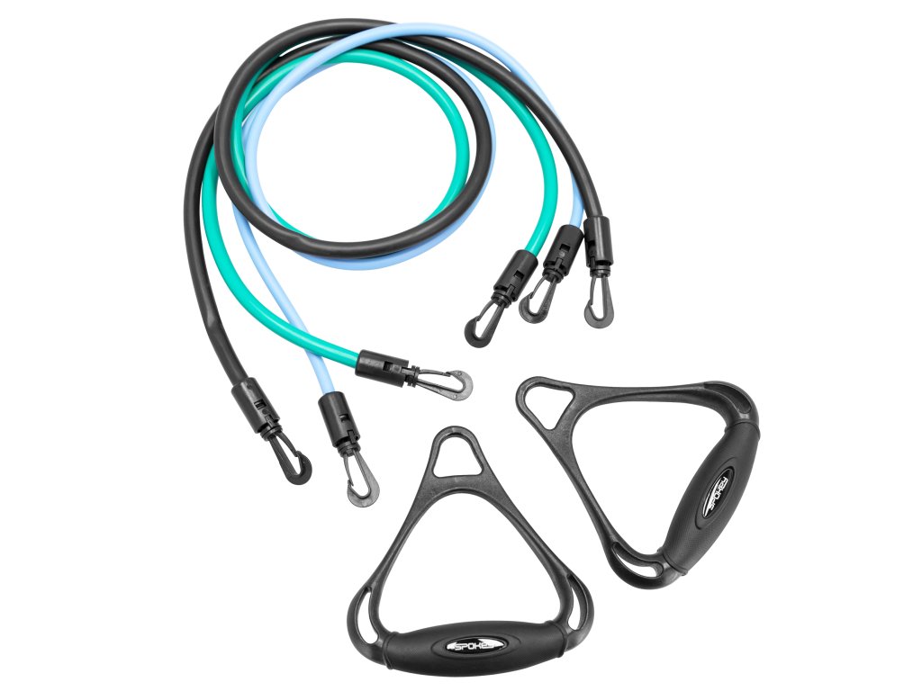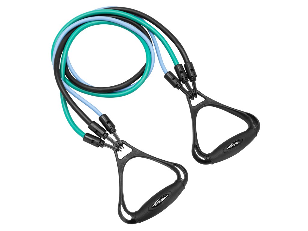 Set obsahuje tvarované a pohodlné rukojetí a 3 odnímatelné gumy, kde každá guma má jiný stupeň odporu. Díky tomu lze libovolně nakombinovat a nastavit až 7 různých obtížností a přizpůsobit tak intenzitu tréninku vašim potřebám:
