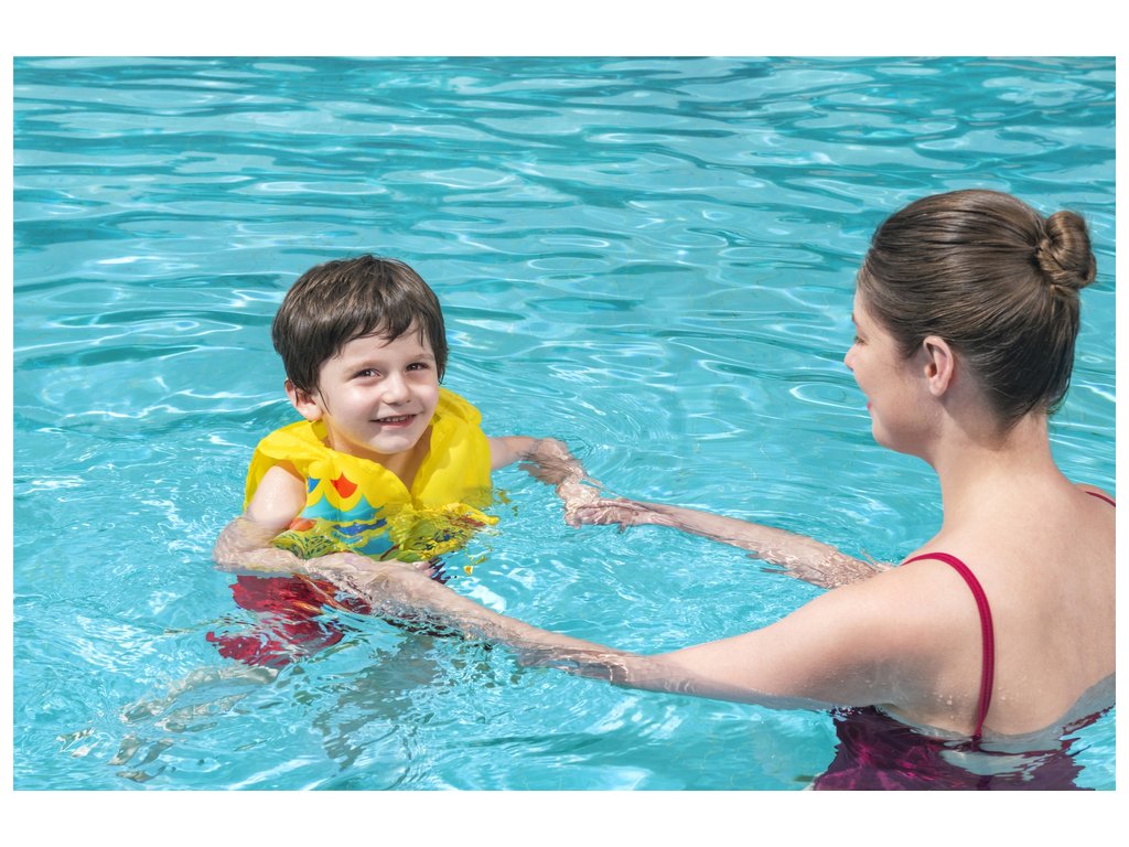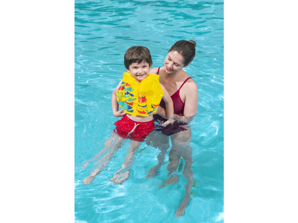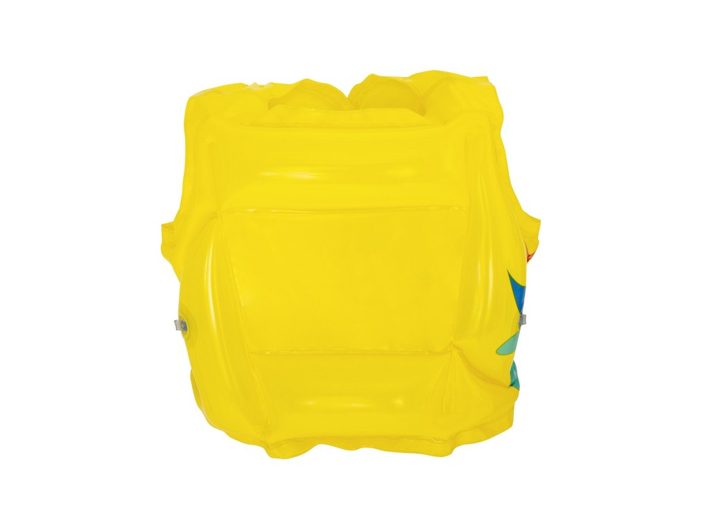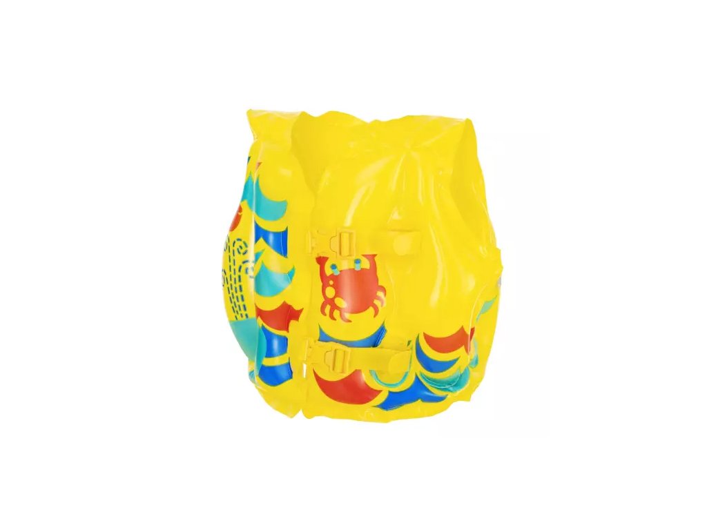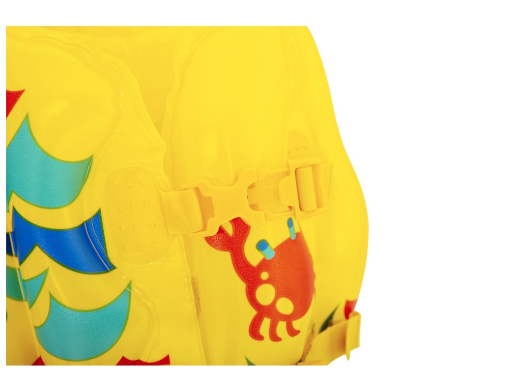 Žlutá plavecká vesta pro děti ve věku 3 až 6 let je opatřena přezkami pro snadné a bezpečné zapínání. Tato vesta je navržena pro pohodlí a bezpečnost během vodních aktivit.