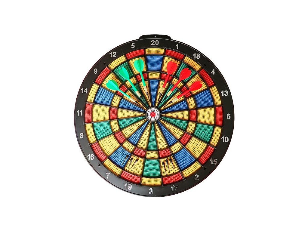 Softový terč pro šipky s plastovými hroty je ideální pro bezpečnou hru doma nebo ve školách. Terč má průměr 45 cm a je dírkovaný, což umožňuje snadné zachycení šipek s plastovými hroty. Součástí balení je 6 šipek s plastovými hroty (v bílé nebo černé barvě) a 6 náhradních hrotů v černé barvě.